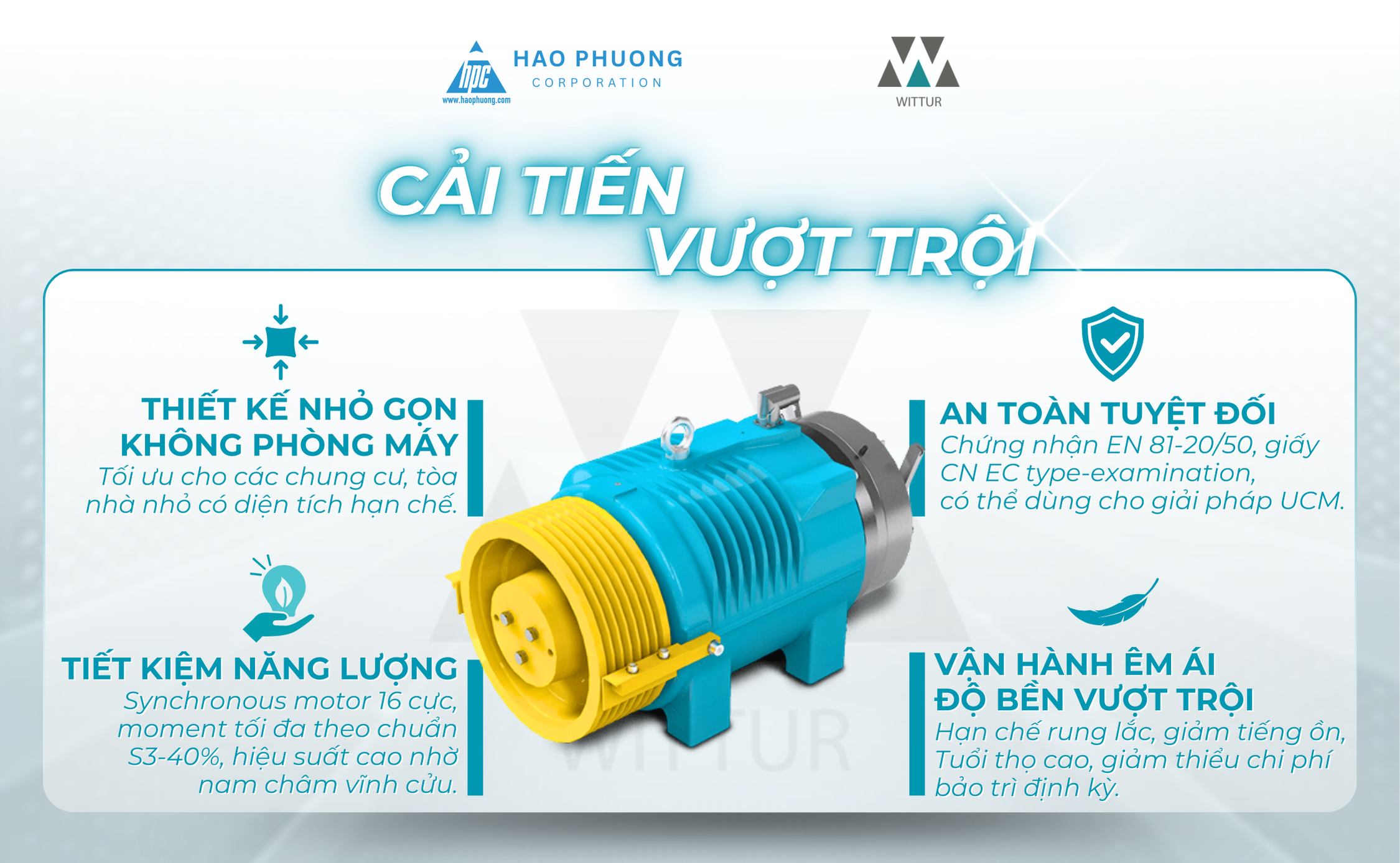 Hạo Phương tự hào là nhà phân phối chính hãng các dòng máy kéo Wittur tại Việt Nam. Không chỉ phân phối thiết bị chính hãng, Hạo Phương còn cung cấp giải pháp thang máy trọn gói: từ tư vấn kỹ thuật chu đáo, cung ứng linh kiện chính hãng đến lắp đặt – bảo trì chuyên nghiệp. Với hơn 20 năm kinh nghiệm và đội ngũ chuyên môn cao, Hạo Phương giúp Quý khách tối ưu chi phí vận hành dài hạn, đảm bảo hiệu quả và sự an tâm cho mọi dự án.