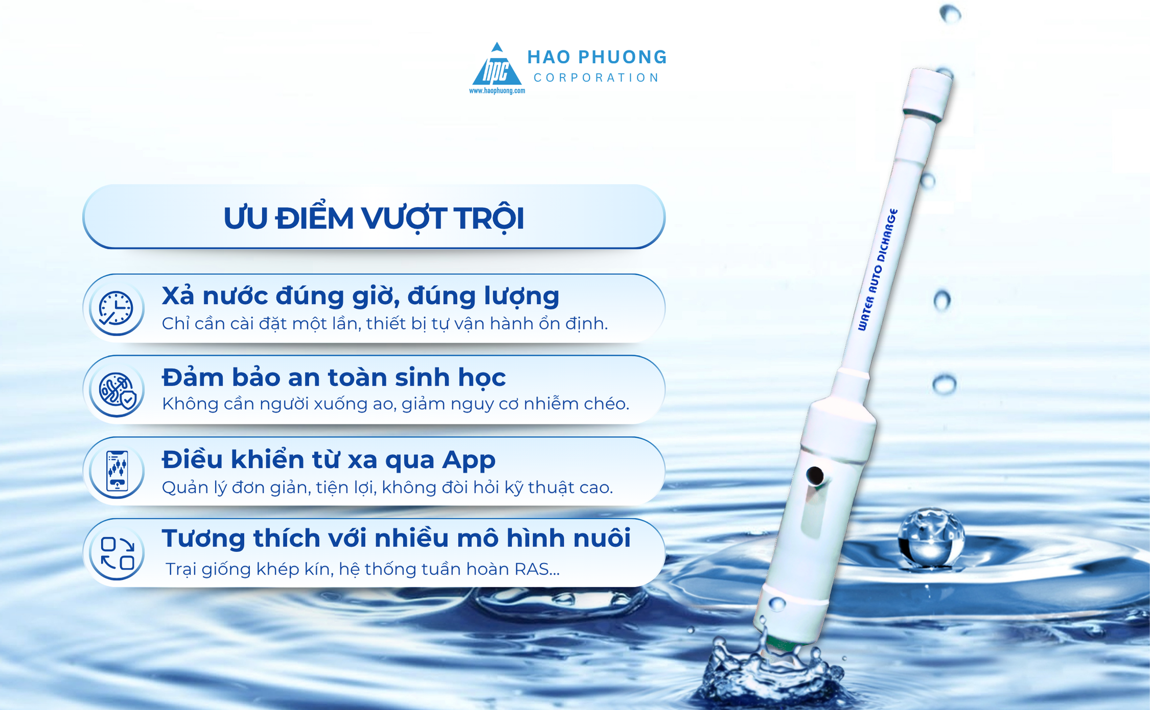 Thấu hiểu những khó khăn trên, Hạo Phương đã nghiên cứu và phát triển Thiết bị xả nước tự động (Water Auto Discharge) – giải pháp tối ưu giúp chủ trại kiểm soát chất lượng nước hiệu quả, giảm rủi ro và tiết kiệm chi phí.