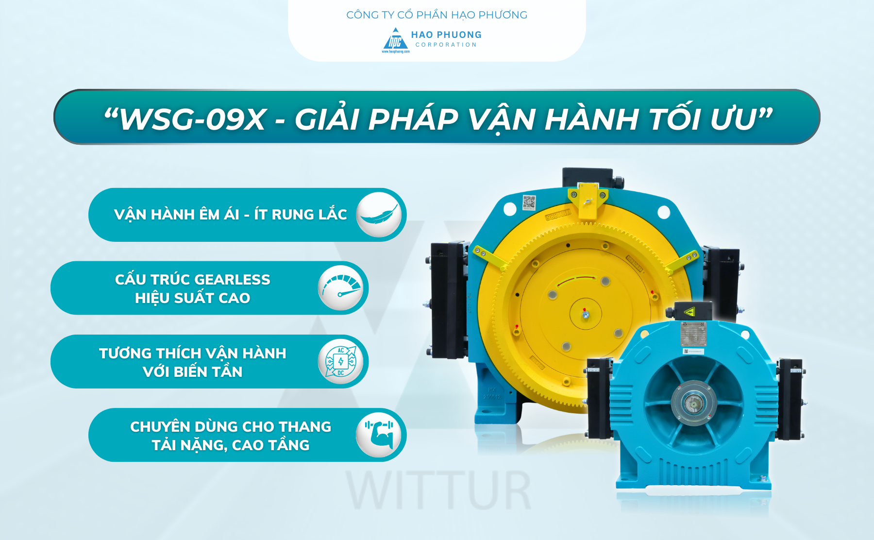 Hạo Phương hân hạnh cung cấp dòng sản phẩm máy kéo Wittur tại Việt Nam, đồng hành cùng các đơn vị lắp đặt – vận hành trong việc xây dựng hệ thống thang máy an toàn – bền bỉ – hiện đại.